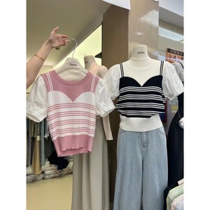 春季针织毛织衫女韩版新款圆领温柔风淑女拼接洋气休闲短袖上衣潮