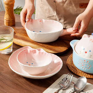 漫画かわいいビープ音猫陶磁器ボウルカップラーメンボウルサラダボウルハンドルボウル皿釉薬下彩子供食器卸売り