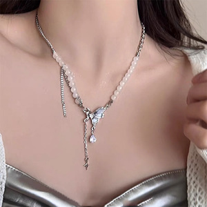 甘いクールな風の蝶の真珠のネックレスの女性の新型の2024の爆発的な金の鎖の鎖は小さい大衆の軽い豪華な高級感の首の鎖を飾ります。