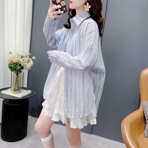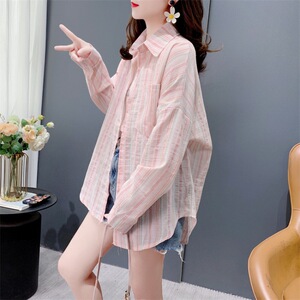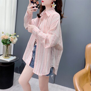 文芸の青いストライプの日焼け止めのシャツの女性の夏の港の風のゆったりしている長袖のカーディガンの軽い熟している薄いタイプのコートの上で服を着ます。