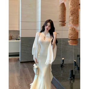 新中式盘扣改良旗袍连衣裙女春季针织裙子温柔风无袖修身鱼尾长裙