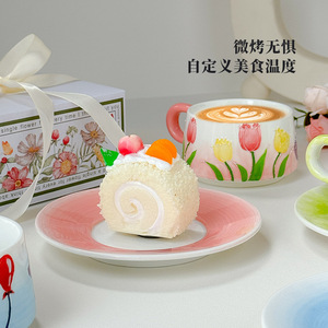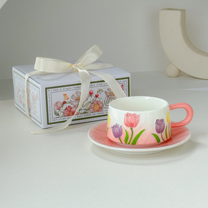 レトロなチューリップ柄のコーヒーカップ&ソーサーセット、アフタヌーンティーカップ、クリエイティブなマグカップ、ウォーターカップ、セラミックカップ、上品な