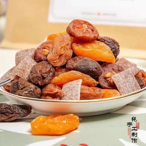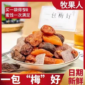 牧果人包梅の多くの味が手の砂糖漬けの果物を混ぜて甘酸っぱいネットの赤い間食の果物の製品を組み合わせます。