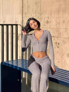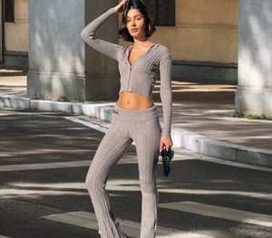 ニットの2つのセットの欧米の越境する新型のファッションのカジュアルな気質は帽子の上着のストレートなズボンのセーターのスーツの女性と一緒にいます。