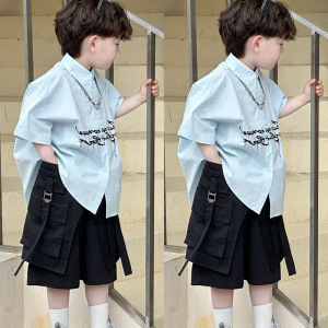 ボーイズ 2025 夏新作子供ベビーレタープリントラペルブルーシャツ小中型子供ファッショントレンドトップス