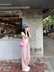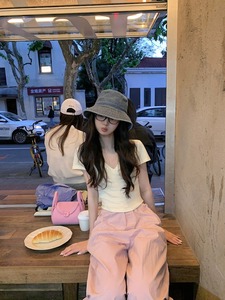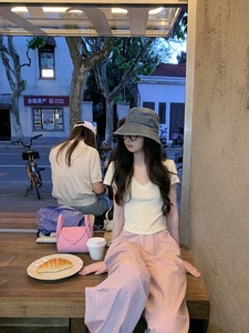 ドーパミン系セクシーVネックショート丈スリムフィット半袖Tシャツピンクゆったりワークウェアカジュアルパンツレディース夏ファッションセット