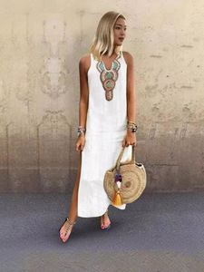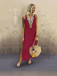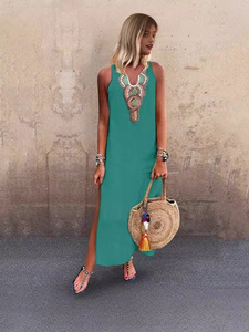 2024レディース新しいカジュアルゆるい綿麻ボヘミアンセクシーノースリーブ深いvネックサイドオープンフォークドレス