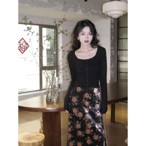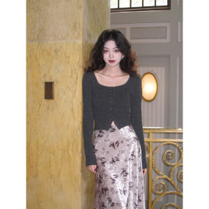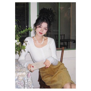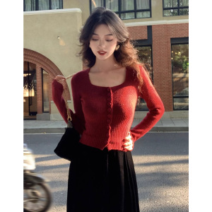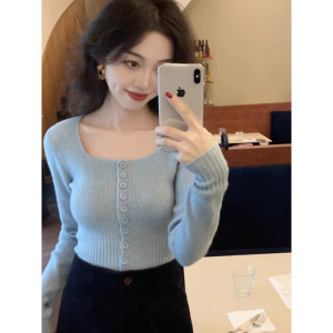 春季新款收腰显瘦针织衫女秋季法式方领修身百搭T恤上衣潮毛织衫