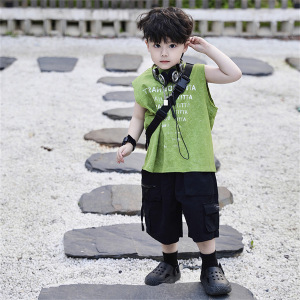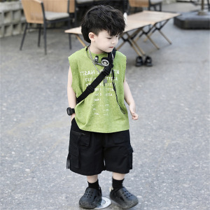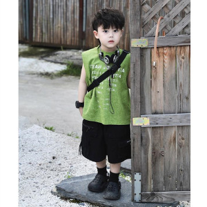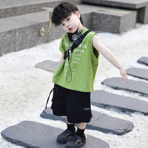 ボーイズ韓国ハンサムカジュアルスーツ2025夏新スタイル中大型子供レターグリーンベストノースリーブTシャツ
