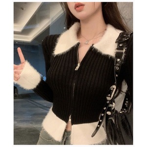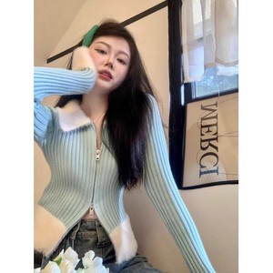ピンクとブルーのステッチニットセーター、女性用、秋冬、純粋で甘くてスパイシーなデザイン、毛皮の襟、ジッパー付きカーディガン、ショートスタイル