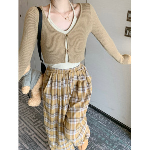 辣妹套装女挂脖吊带背心秋季卡其色长袖针织衫短款外套时尚两件套
