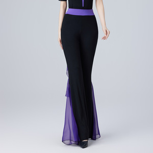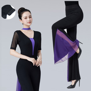 黒と紫のスプリットトップ + 紫のウエストと紫の大きなフレアパンツ (モダールパンツ) + ネックガーゼ