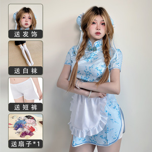 青い新中国式チャイナドレス + 本の白いメイドエプロン