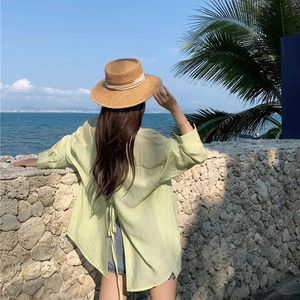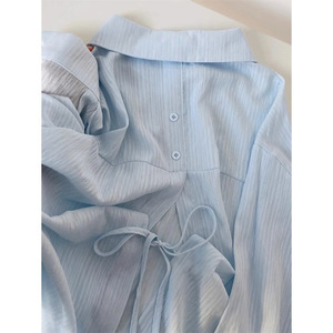薄いタイプの微透長袖日焼け止めカーディガンの背中には、青いシャツ付きの女性夏のファッションカジュアルシャツのコートがあります。