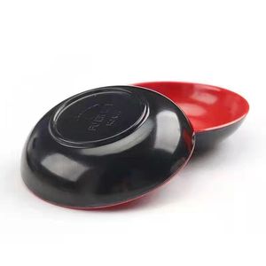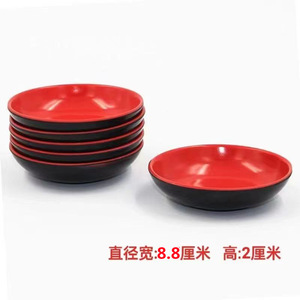 プラスチックのメラミンの小皿の調味料の皿に酢の皿をつけて調味料の皿に味噌の皿の赤と黒の2色の鍋の皿をつけます。