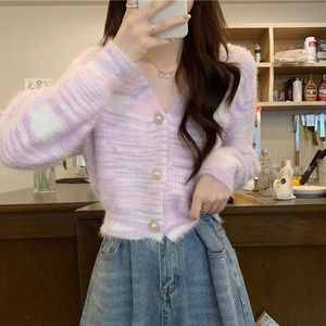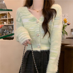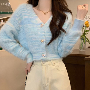 虹のストライプのvネックのニットのカーディガンの女性の秋冬の短いタイプの高腰の春の服のセーターの小さい背の独特な絶景の上着