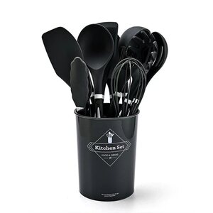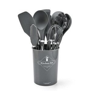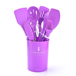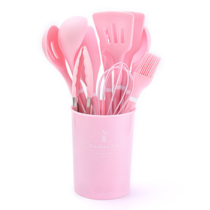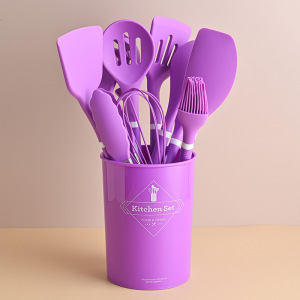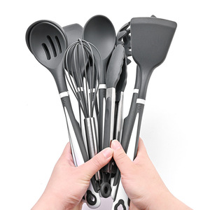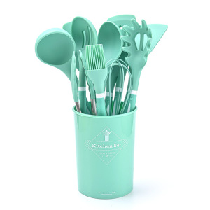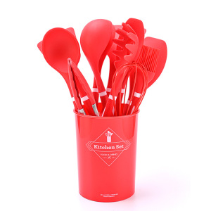 国境を越えた供給シリコンキッチン用品プラスチックハンドル12点セット食品グレードのノンスティック調理用スプーンとスパチュラ収納バケツセット