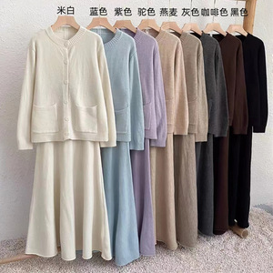 怠惰な風の純色のニットのセーターのスーツの女性の秋冬の新型の韓国版の簡単でカジュアルなカーディガンの半身のスカートの2つのセット