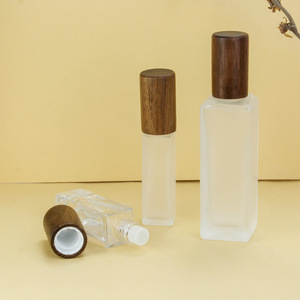 シルバーノズル+ウォールナット蓋付き、30mlフロストスクエアボトル37、ガラス