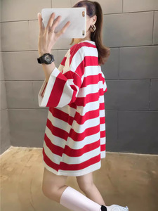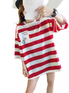 2024夏の女装百合縞ゆるい中長のtシャツ女性半袖が痩せているシャツins潮女性半袖