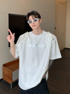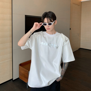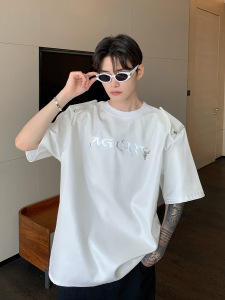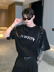 ネット赤同モデル小衆液体金属光沢面肩半袖男性ゆるい高級デザインtシャツ夏ファッション薄い