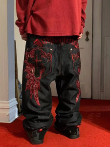 クロスボーダーメーカー直販アメリカンレトロ刺繍トレンディブランドヒップホップストリートワイドレッグハイウエストジーンズカジュアルで多用途