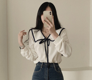 韓国のchi春のフランス風の雰囲気の大きい襟のリボンのデザインはゆったりしています。