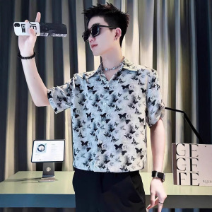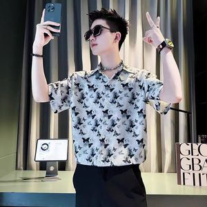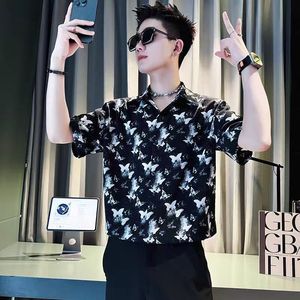 高級感蝶プリント半袖シャツ男性用夏の薄い袖シャツ
