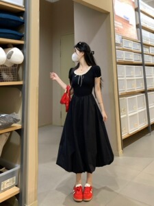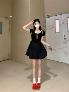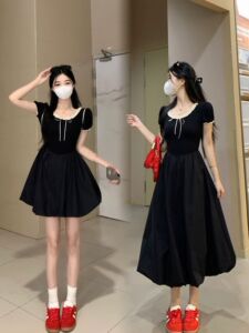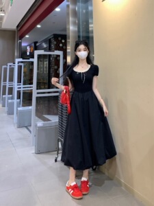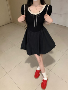 2025年大码甜美少女蕾丝大圆领泡泡袖拼接收腰显瘦蓬蓬连衣裙