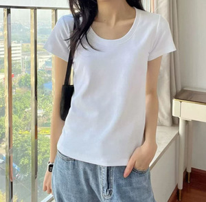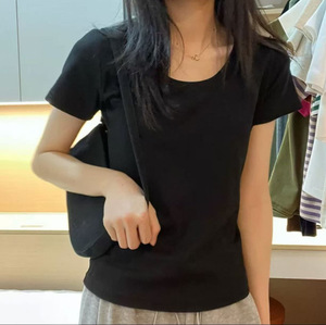 クラシックベーシックUネックグレー万能半袖Tシャツレディースアメリカンスリムフィット半袖トップローネックボトリングシャツ