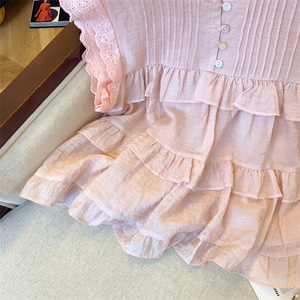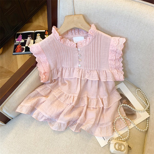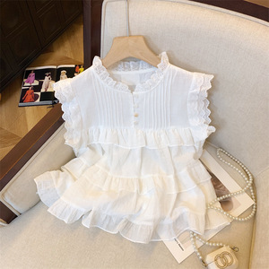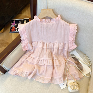 実拍甘重工レース飛袖シャツ2024夏韓系ins小衆シワ上着女