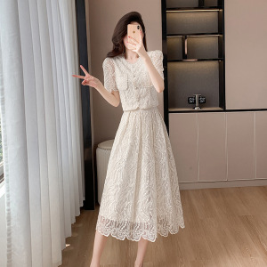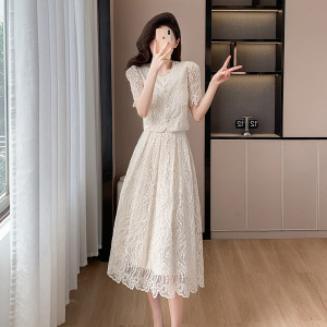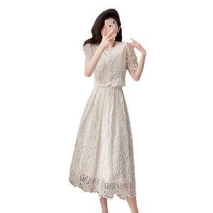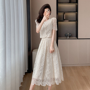 実拍高級感の名媛小香風釘珠水溶レースの短い上着高腰大振り子スカートセット9201
