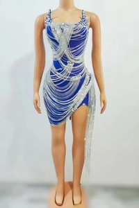 欧米の女性歌手のステージ衣装、ラインストーンチェーンフリンジ付きのストラップレスドレス、エレガントな衣装