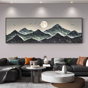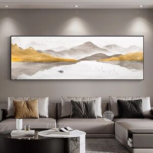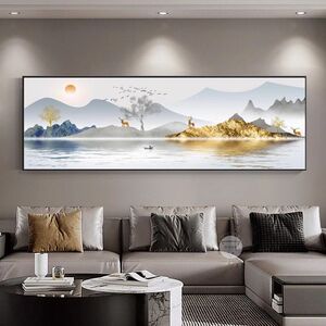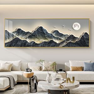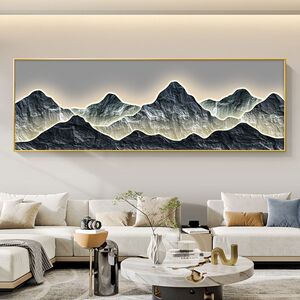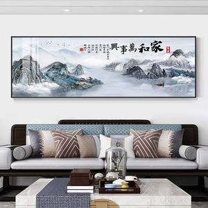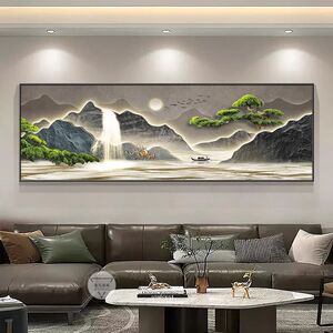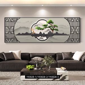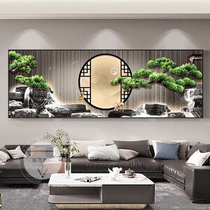 流水生財客間装飾画新中国式ソファー背景壁掛け画迎客松禅意茶室山水壁画
