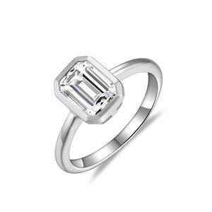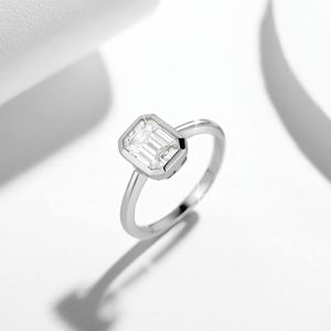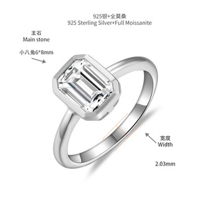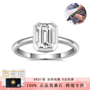 新款ins风6*8mm祖母绿切莫桑石包镶长方形S925银镀18k白金戒指女