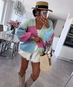 クロスボーダーアマゾン新作カラフルチェック柄ステッチコントラストゴールドラインニットカーディガンカジュアルルーズセータージャケット女性用