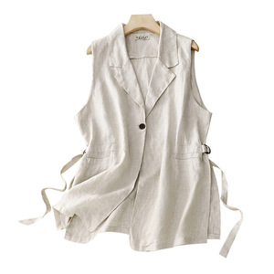 夏の新しい大きいサイズの綿とリネンのベスト、ゆったりとした女性のチョッキが付いたミッドレングスの薄いノースリーブスーツベスト