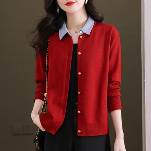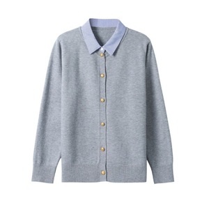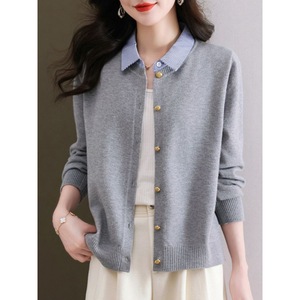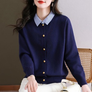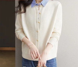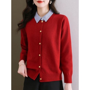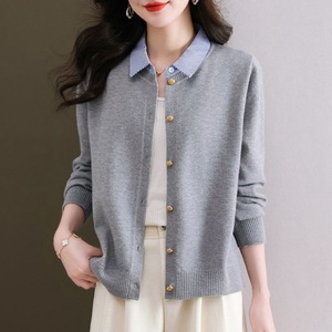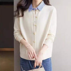 2025新款假两件长袖针织开衫女春季条纹拼接衬衫领单排扣时尚毛衣