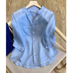 シンプルで快適な天糸リネンブルー五分袖シャツ