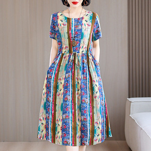 中高年女性綿のワンピース40-50歳のお母さんは夏の半袖がゆったりしています。