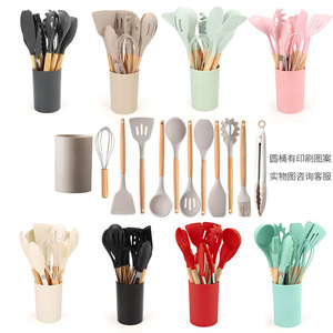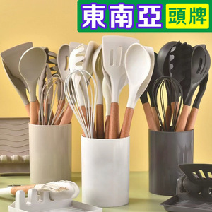 木柄硅胶厨具套装 锅铲汤勺不粘锅12件套装 kitchenset东南亚跨境