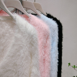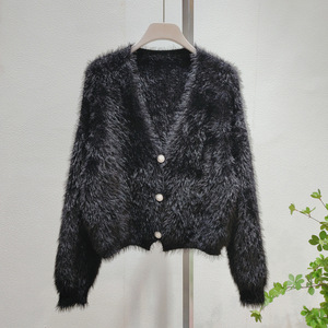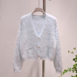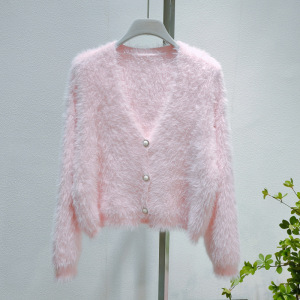 婦人服はミンクの毛のニットのカーディガンの秋冬の新型の白い上着の短いタイプのゆったりしている外にセーターのコートの婦人服を着ます。