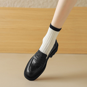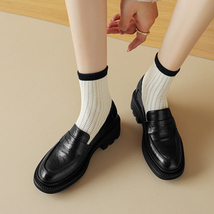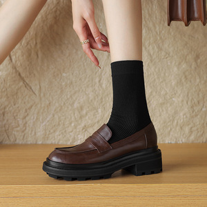 トップ層牛革2024年春秋ラウンドヘッド厚い底シングルシューズ女性靴防水台の中で楽福靴と一緒に漕いでいます。