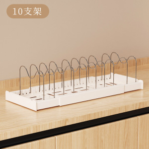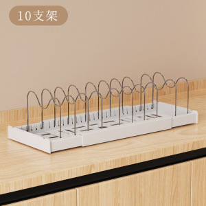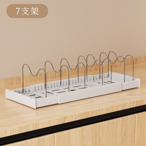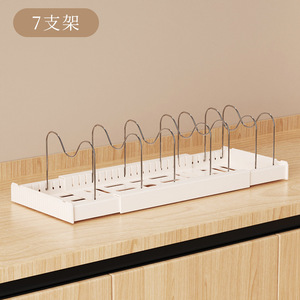 台所の物置棚は伸縮可能で、鍋蓋棚の収納ケースを調節できます。