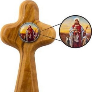 メーカーのクロスは木製のイースター装飾の実木の置物のキーホルダーを握ってオリーブの木のクロスを祈ります。