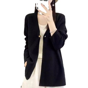 秋冬の新型の一粒はファッションのメリヤスのカーディガンのセーターの女性vネックの純色のカジュアルな肌に合わせて長袖のコートを掛けます。