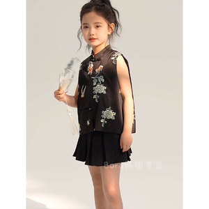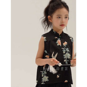 女童汉服夏款2025新款中大童唐装黑色时髦马甲儿童高级洋气上衣潮