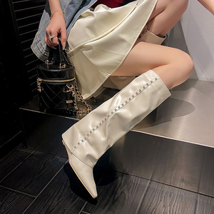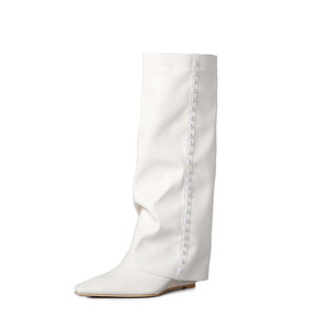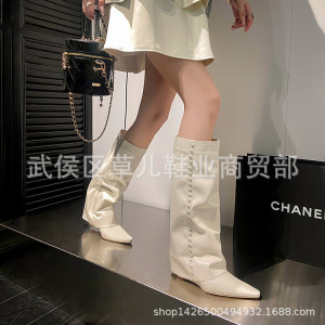 ファッションズボンの靴の女性の高筒のブーツの秋冬の新商品の牛革の坂とハイヒールの先の坂とハイヒールと膝の靴の女性