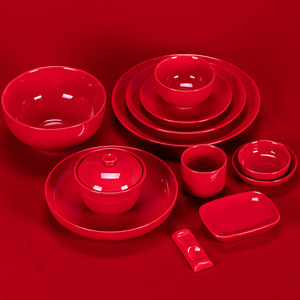 お祝いの赤い陶磁器の食器と皿のスープの碗のステーキの皿の口の杯のシチューの杯