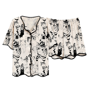 2025年の新型は胸パッド付きのパジャマ女性夏のカーディガン半袖アニメの薄い家庭服セットです。